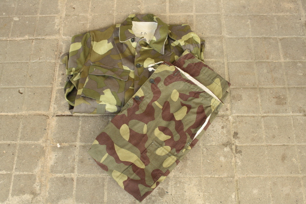 Maastopuvut Armeijan M62 mallia oleva maastopuku, jonka toisella puolella on lumipuku |